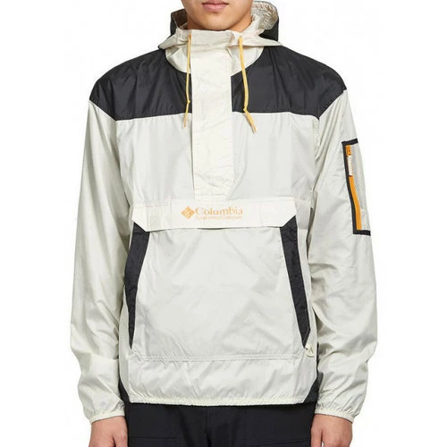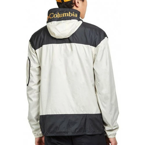 Veste coupe-vent Columbia CHALLENGER – Réf. 1714291-191. Couleur : Beige, Noir. Détails. – Col capuche avec cordon de serrage. – Manches longues. – Fermeture du col par zip métallique et velcro. – Elastique de maintien à la taille et aux poignets. – Poche zippée sur la manche gauche. – Poches pour les mains. – Imprimé Columbia sur la capuche et sur le devant. Matière : 100% polyester.