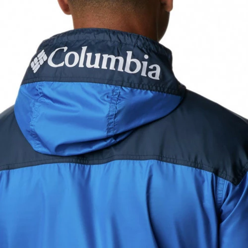 Veste coupe-vent Columbia CHALLENGER – Réf. 1714291-432. Couleur : Bleu, Bleu marine. Détails. – Col capuche avec cordon de serrage. – Manches longues. – Fermeture du col par zip métallique et velcro. – Elastique de maintien à la taille et aux poignets. – Poche zippée sur la manche gauche. – Poches pour les mains. – Imprimé Columbia sur la capuche et sur le devant. Matière : 100% polyester.