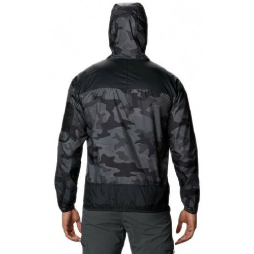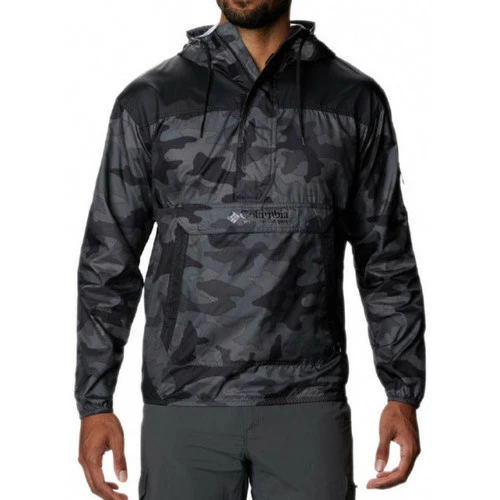 Veste coupe-vent Columbia CHALLENGER – Réf. 1714291-015. Couleur : Noir camouflage. Détails. – Col capuche avec cordon de serrage. – Manches longues. – Fermeture du col par zip métallique et velcro. – Elastique de maintien à la taille et aux poignets. – Poche zippée sur la manche gauche. – Poches pour les mains. – Imprimé Columbia sur la capuche et sur le devant. Matière : 100% polyester.